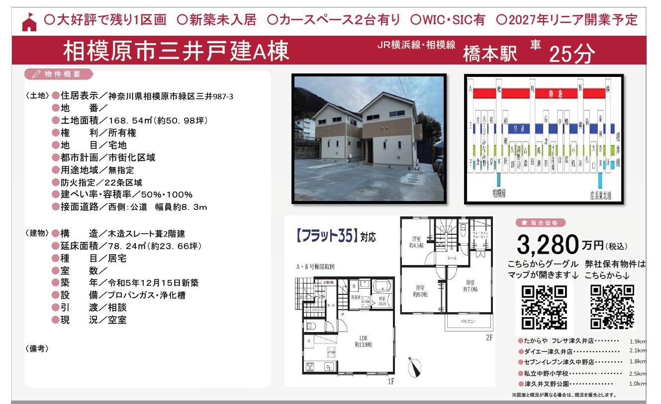 〇大好評で残り1区画〇新築未入居〇カースペース2台有り〇WIC・SIC有〇2027年リニア開業予定